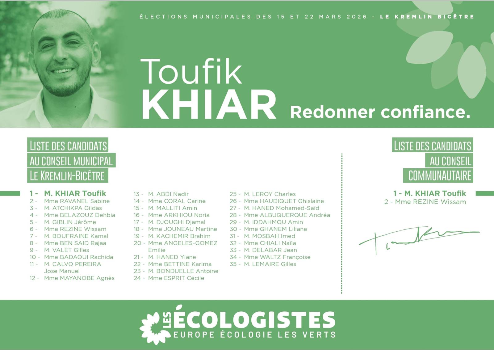 Toufik Khiar, citoyen engagé et membre actif des Écologistes, je me présente aux élections municipales de 2026 au Kremlin-Bicêtre avec une vision claire : construire une ville durable, solidaire et tournée vers l'avenir.